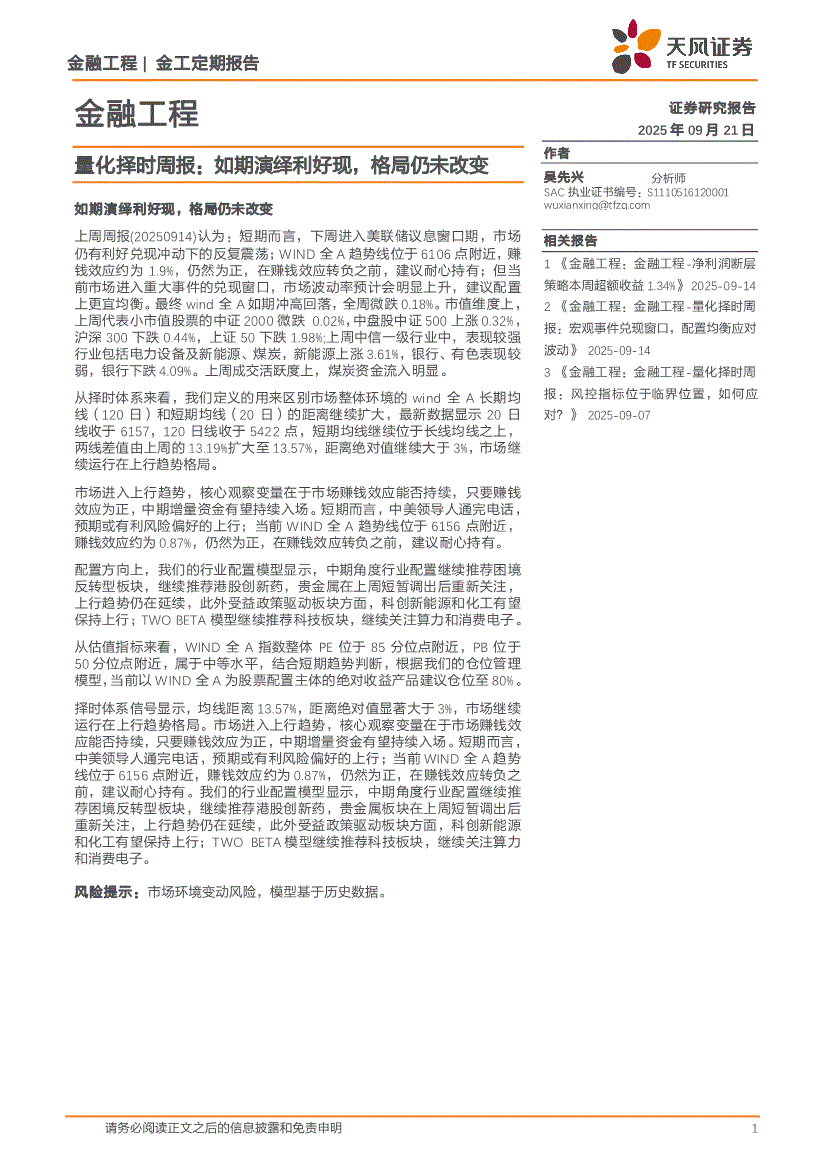 天风证券-量化择时周报:如期演绎利好现,格局仍未改变-250921