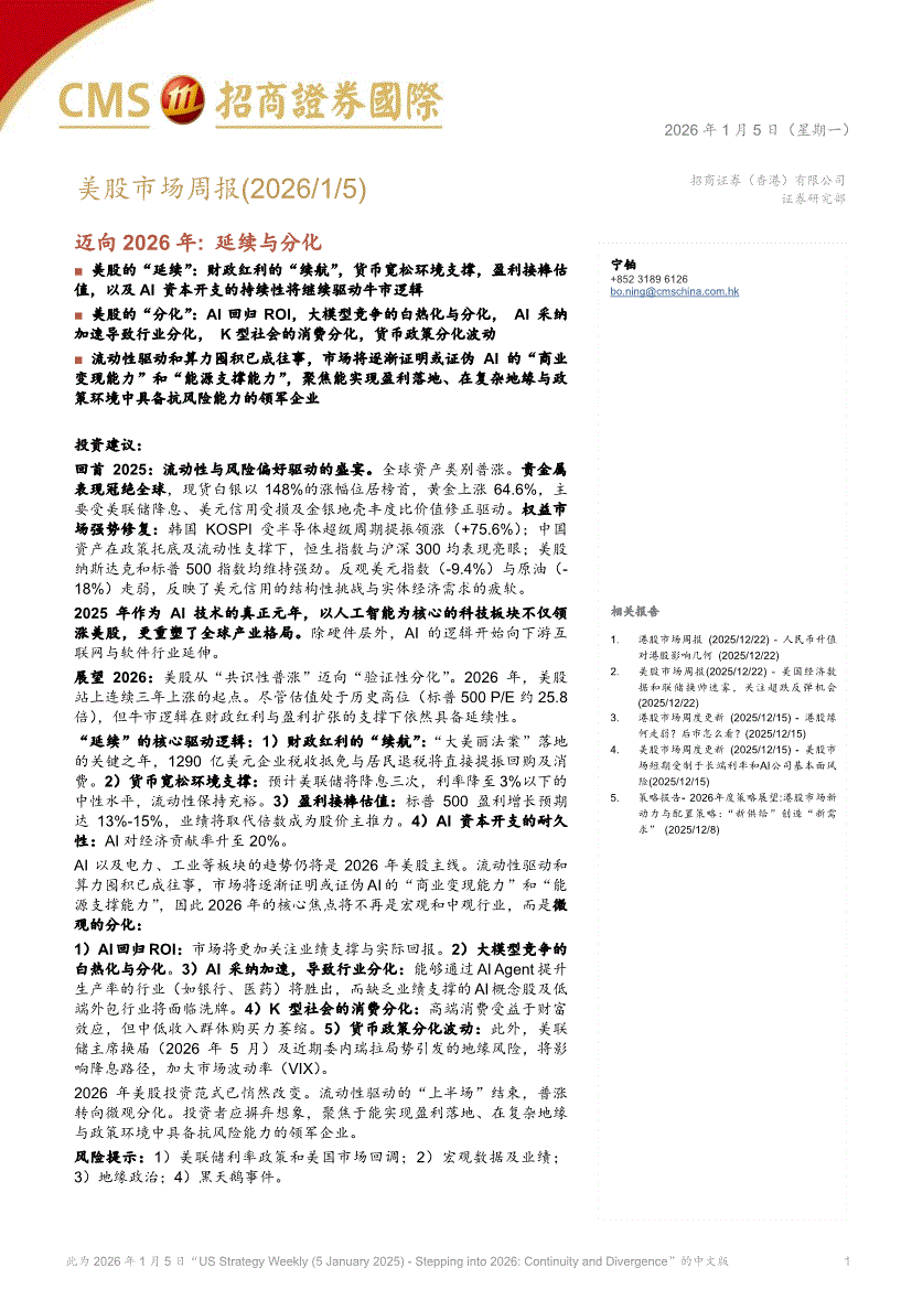 招商证券(香港)-美股市场周报:迈向2026年,延续与分化-260105