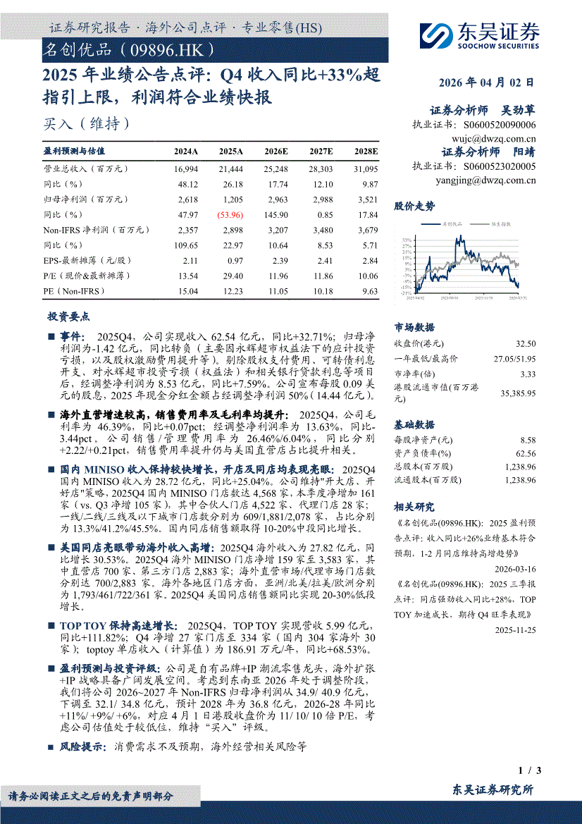 名创优品:东吴证券-名创优品-9896.HK-2025年业绩公告点评:Q4收入同比+33%超指引上限,利润符合业绩快报-260402