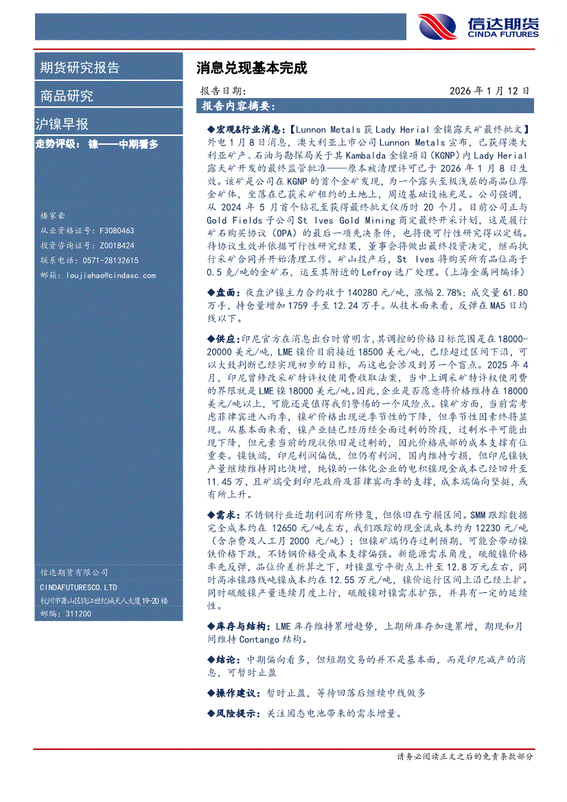 信达期货-沪镍早报:消息兑现基本完成-260114