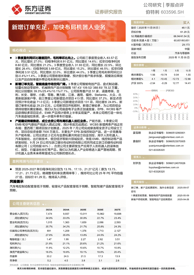 伯特利:东方证券-伯特利-603596-季报点评:新增订单充足,加快布局机器人业务-251105