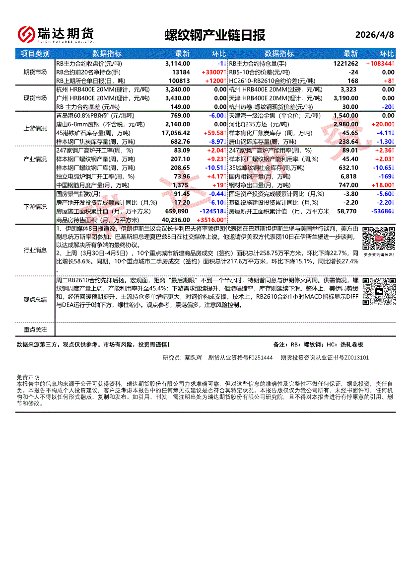 瑞达期货-螺纹钢产业链日报-260407