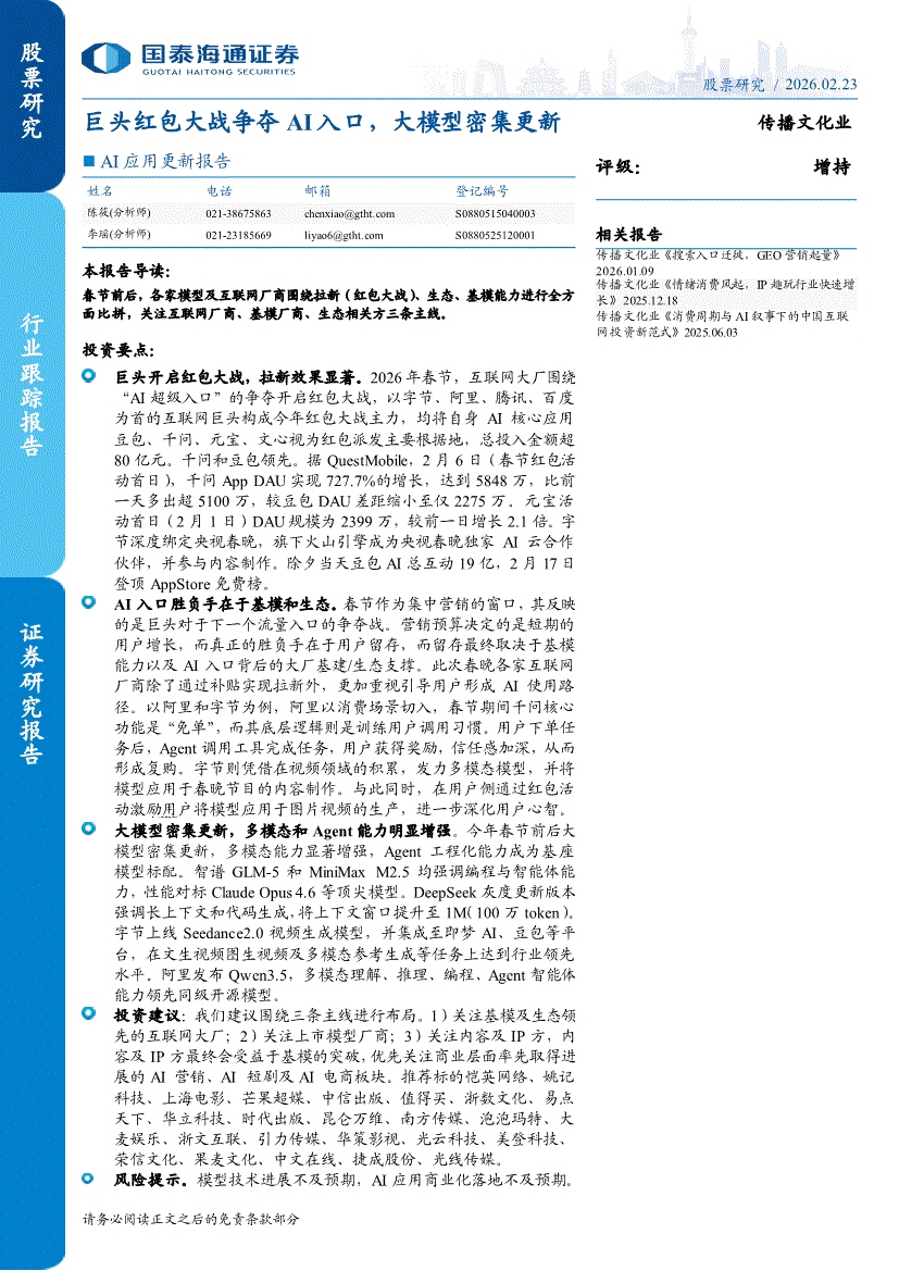 传播文化行业:国泰海通证券-AI应用更新报告:巨头红包大战争夺AI入口,大模型密集更新-260223