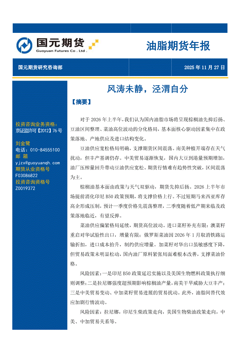 国元期货-油脂期货年报:风涛未静,泾渭自分-251127
