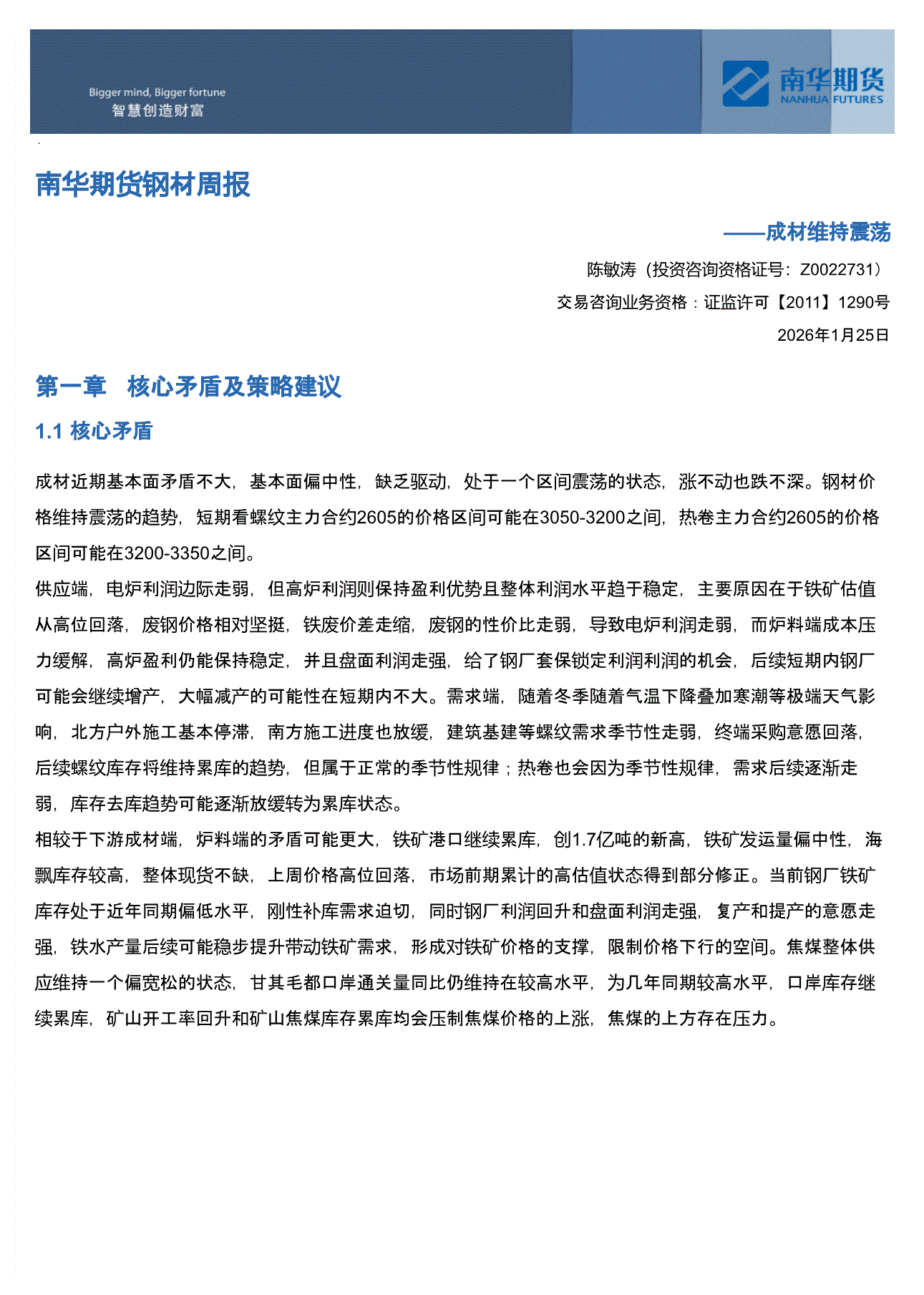 南华期货-钢材周报:钢厂补库加速即将进入尾声,成材维持震荡-260201