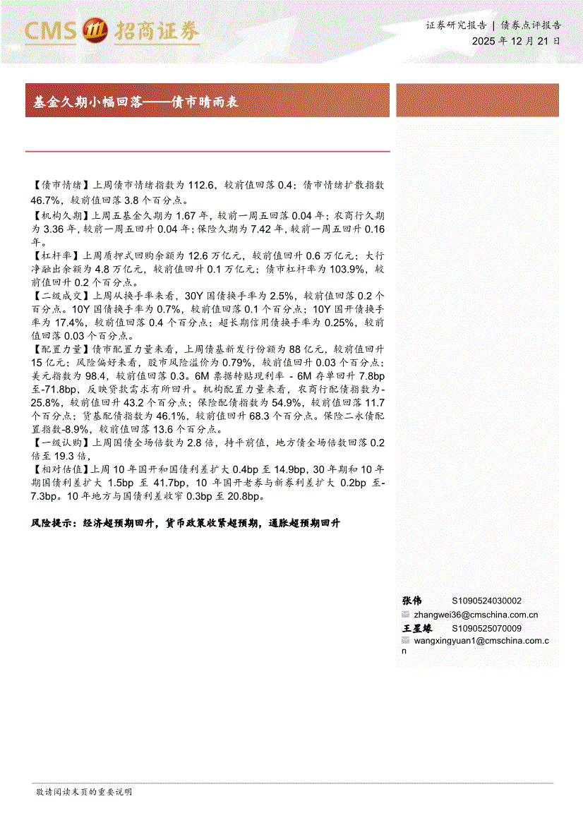招商证券-基金久期小幅回落——债市晴雨表-251221