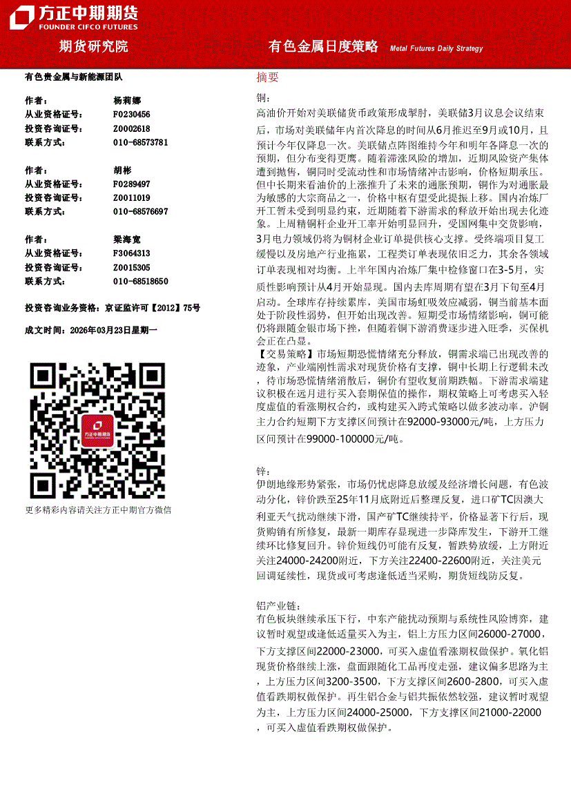 方正中期期货-有色金属日度策略-260323