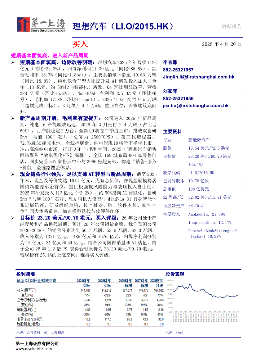 理想汽车:第一上海-理想汽车-LI.US-短期基本面筑底,进入新产品周期-260420