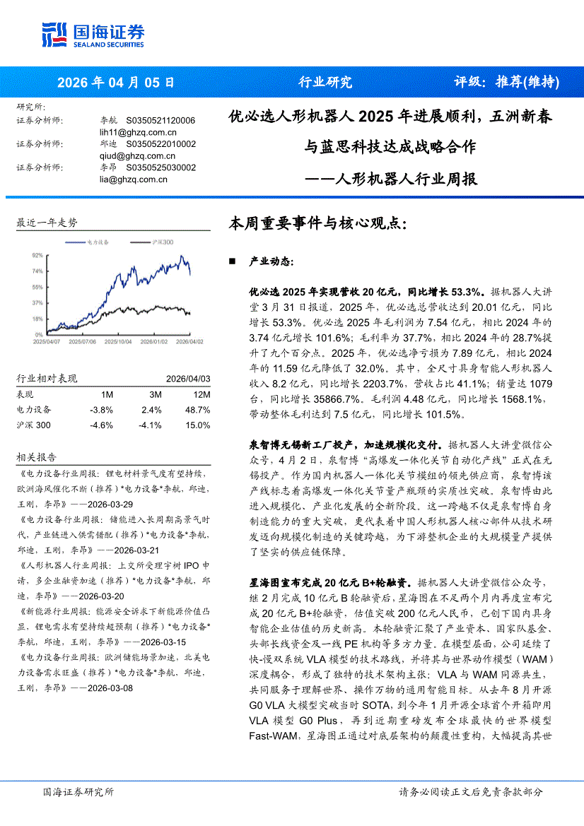 人形机器人行业:国海证券-人形机器人行业周报:优必选人形机器人2025年进展顺利,五洲新春与蓝思科技达成战略合作-260405