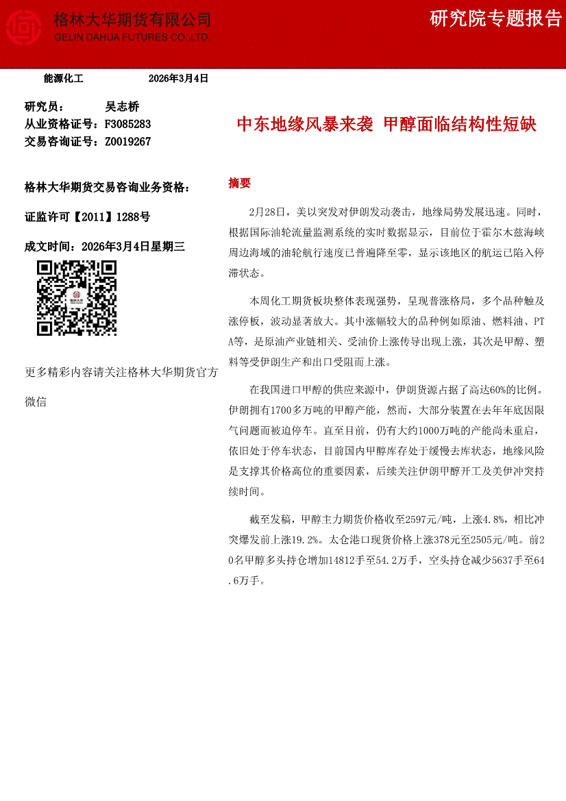 格林大华期货-中东地缘风暴来袭,甲醇面临结构性短缺-260304