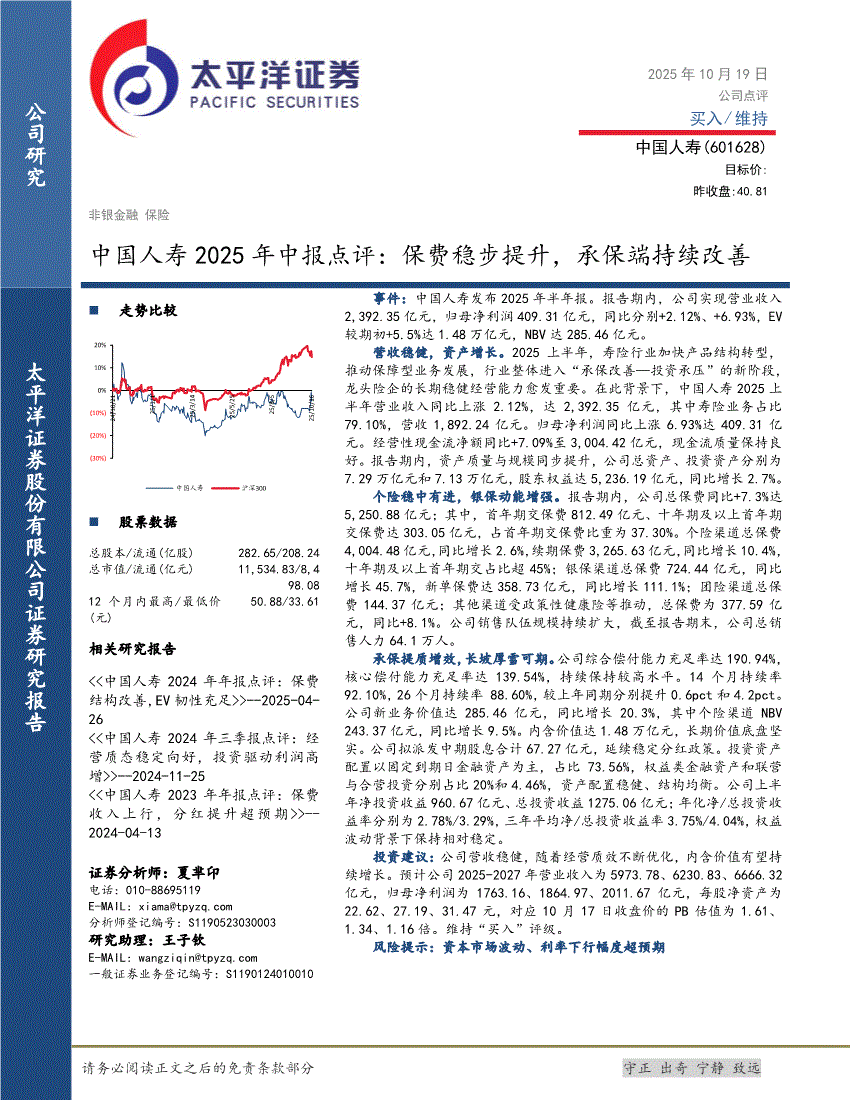 中国人寿:太平洋证券-中国人寿-601628-2025年中报点评:保费稳步提升,承保端持续改善-251019