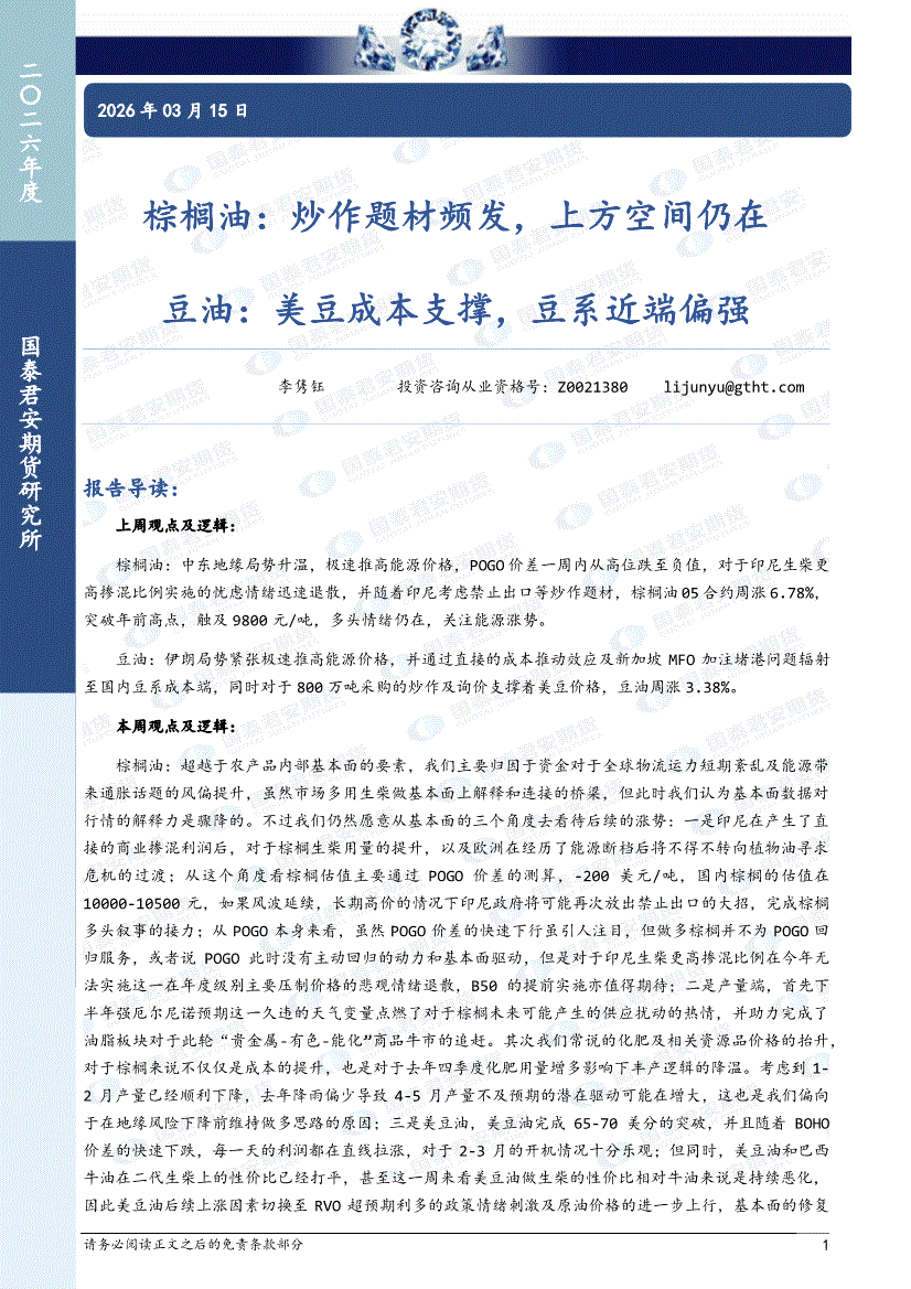国泰君安期货-棕榈油:炒作题材频发,上方空间仍在,豆油,美豆成本支撑,豆系近端偏强-260315