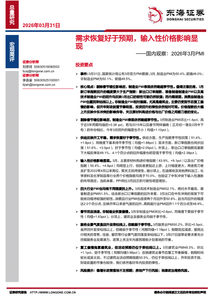 东海证券-国内观察:2026年3月PMI,需求恢复好于预期,输入性价格影响显现-260331