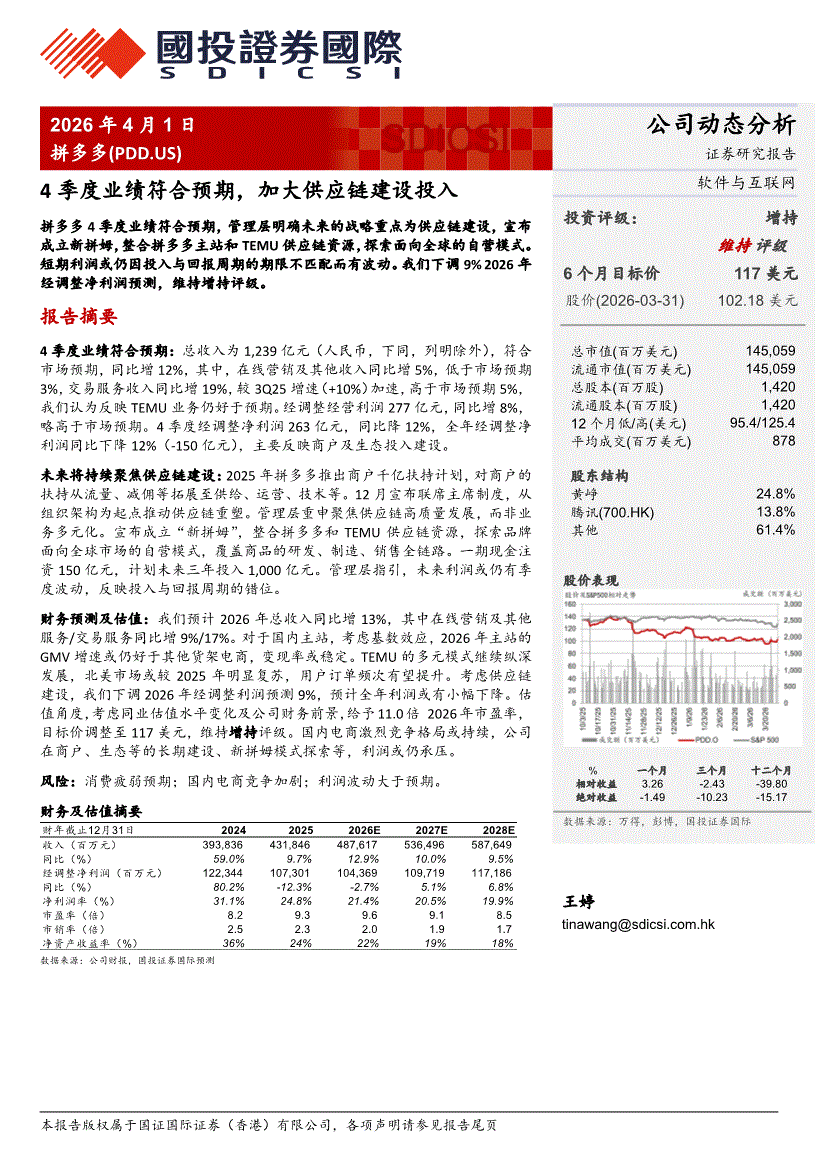 拼多多:国投证券国际-拼多多-PDD.US-4季度业绩符合预期,加大供应链建设投入-260401