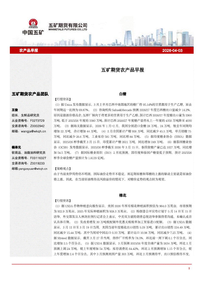 五矿期货-棉花周报:下游情况尚可,但美伊冲突存在外溢风险-260328