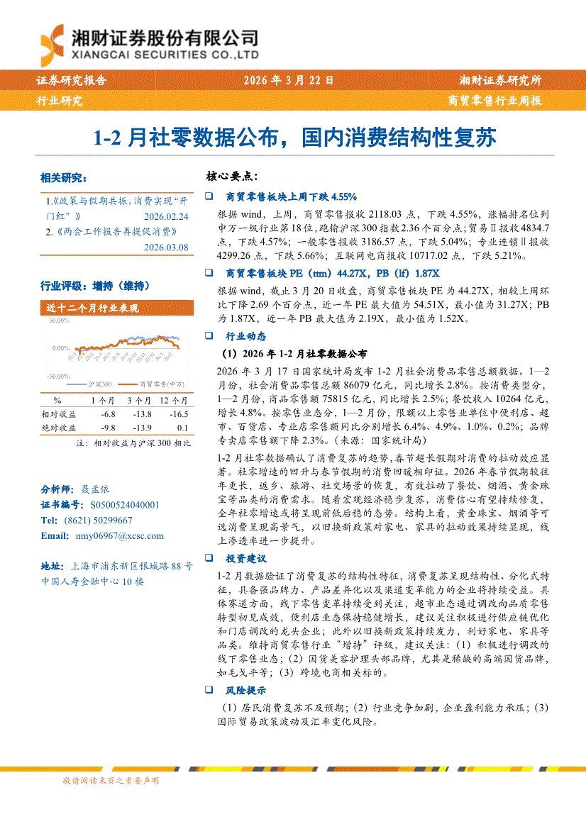 商贸零售行业:湘财证券-商贸零售行业周报:1~2月社零数据公布,国内消费结构性复苏-260322