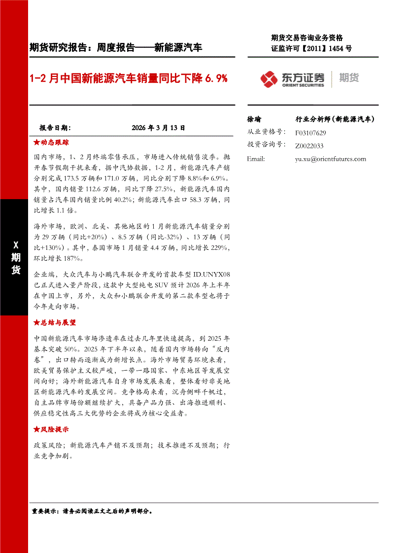 东证期货-期货研究报告:周度报告——新能源汽车,1~2月中国新能源汽车销量同比下降6.9%-260313