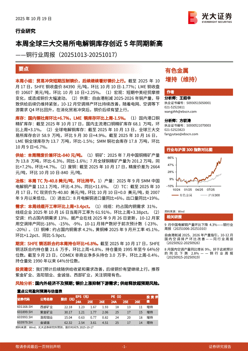 有色金属行业:光大证券-铜行业周报:本周全球三大交易所电解铜库存创近5年同期新高-251019