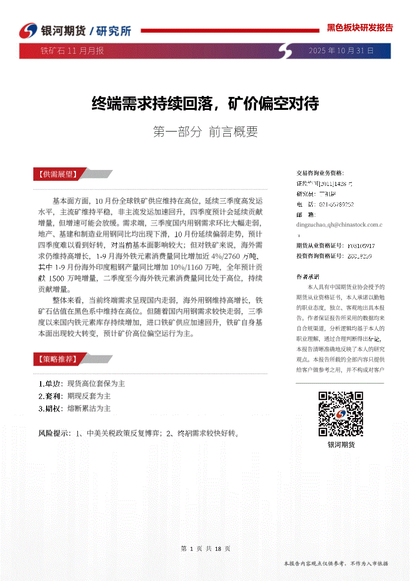 银河期货-铁矿石11月月报:终端需求持续回落,矿价偏空对待-251031