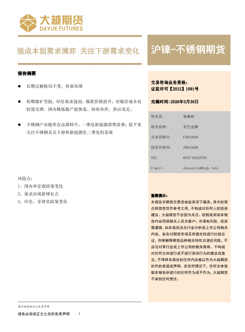 大越期货-沪镍~不锈钢期货月度报告:强成本弱需求博弈,关注下游需求变化-260330