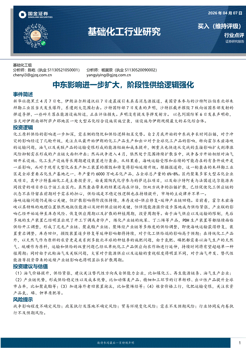 基础化工行业:国金证券-基础化工行业:中东影响进一步扩大,阶段性供给逻辑强化-260407