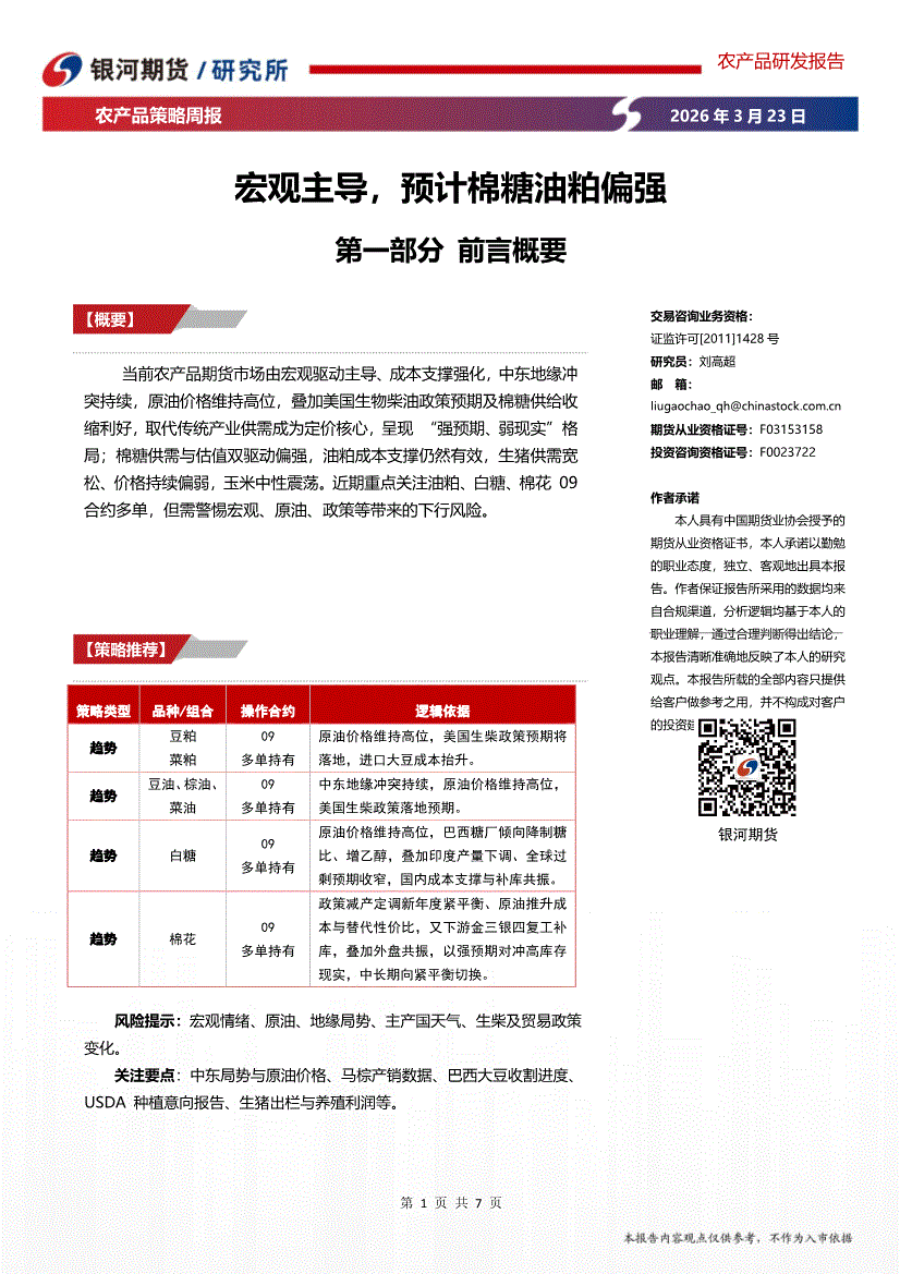 银河期货-农产品策略周报:宏观主导,预计棉糖油粕偏强-260323