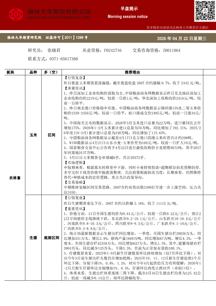 格林大华期货-早盘提示:玉米生猪鸡蛋-260421