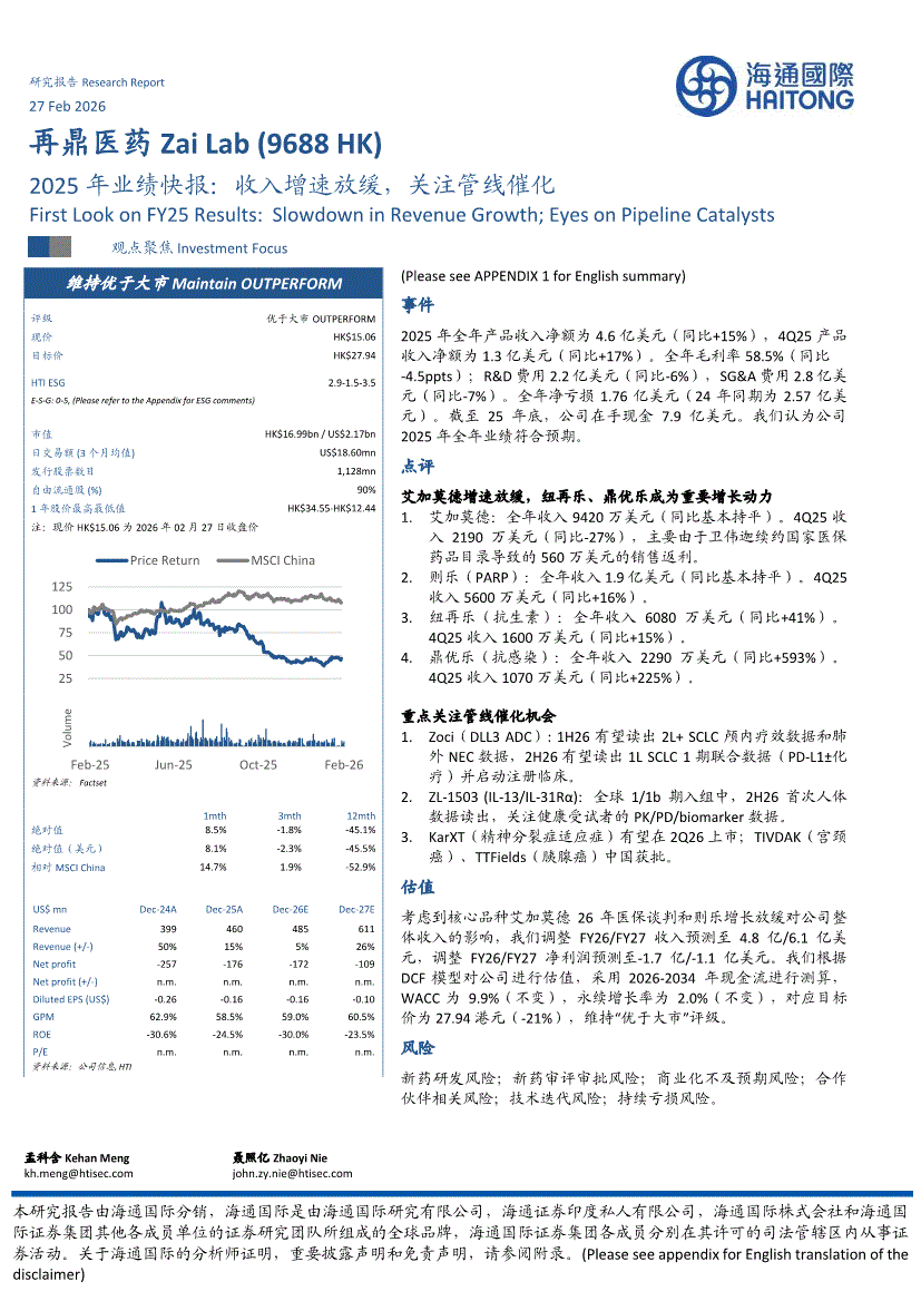 再鼎医药:海通国际-再鼎医药-9688.HK-2025年业绩快报:收入增速放缓,关注管线催化-260227