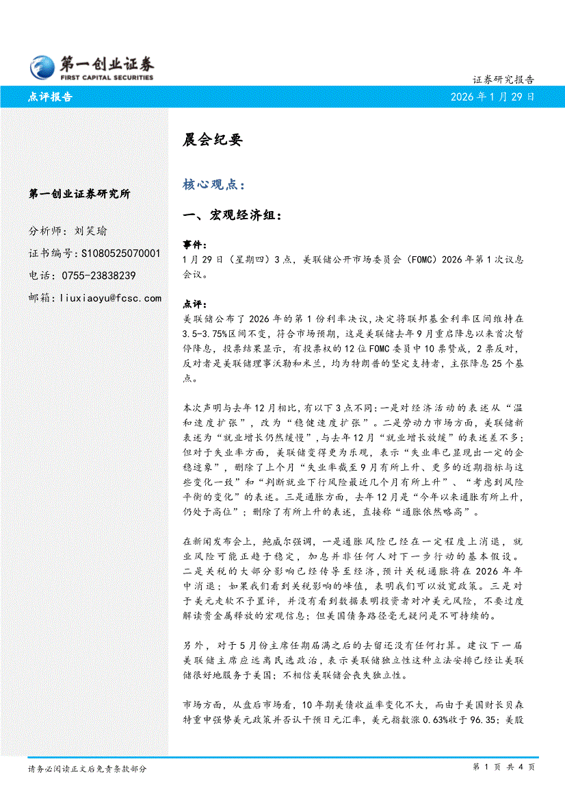 第一创业-晨会纪要-260129