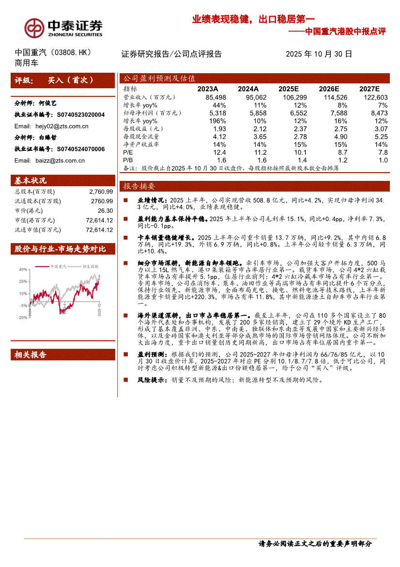 中国重汽:中泰证券-中国重汽-3808.HK-港股中报点评:业绩表现稳健,出口稳居第一-251030