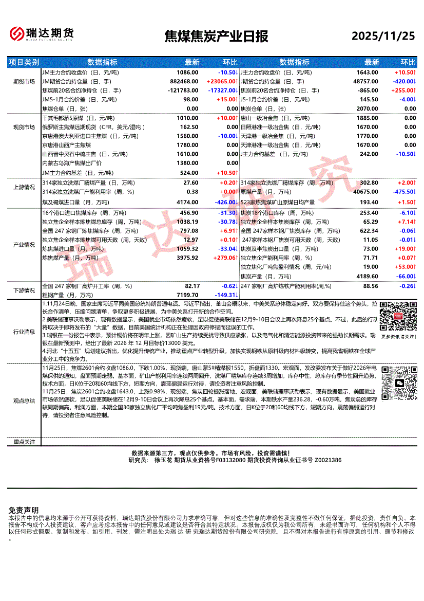 瑞达期货-焦煤市场周报:宏观稳产&供应回升,焦煤期价短期偏弱-251114