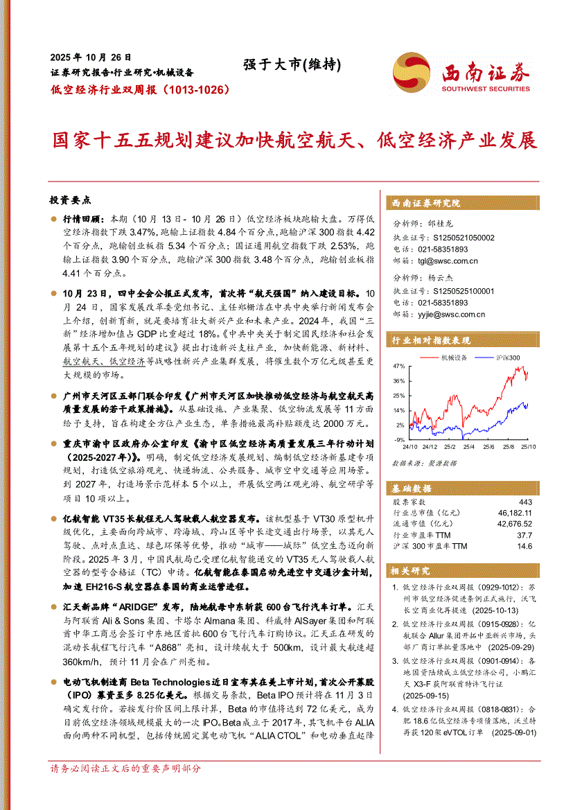 低空经济行业:西南证券-低空经济行业双周报:国家十五五规划建议加快航空航天、低空经济产业发展-251026