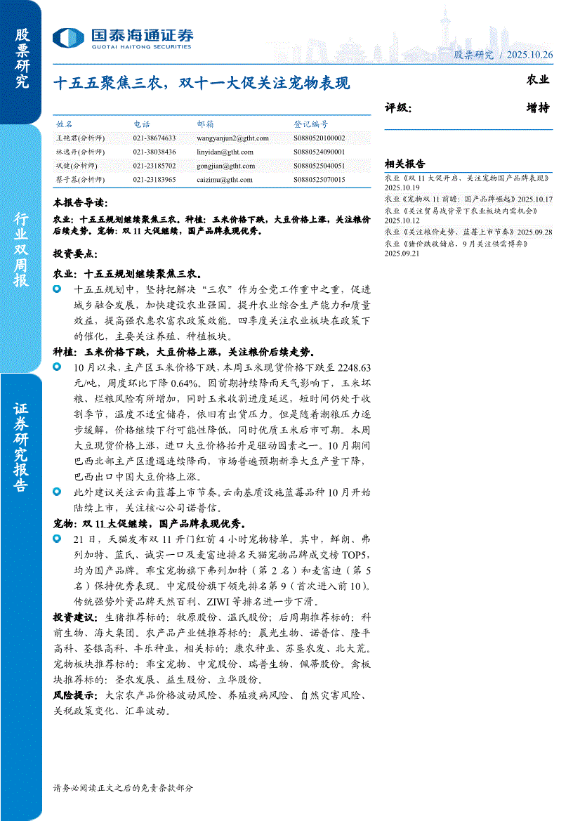农业:国泰海通证券-农业:十五五聚焦三农,双十一大促关注宠物表现-251026