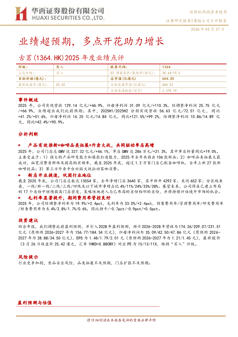 古茗:华西证券-古茗-1364.HK-2025年度业绩点评:业绩超预期,多点开花助力增长-260327