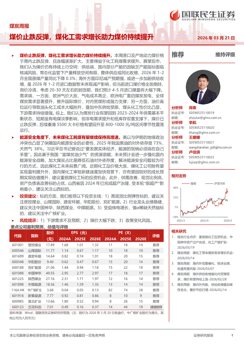 煤炭行业:国联民生证券-煤炭行业周报:煤价止跌反弹,煤化工需求增长助力煤价持续提升-260321