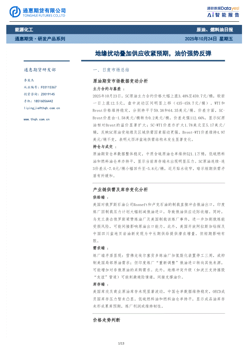 通惠期货-原油、燃料油日报:地缘扰动叠加供应收紧预期,油价强势反弹-251024