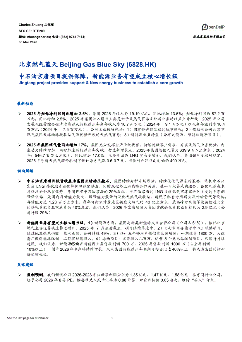 北京燃气蓝天:环球富盛-北京燃气蓝天-6828.HK-中石油京唐项目提供保障,新能源业务有望成立核心增长级-260330