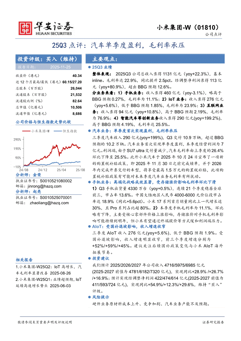 小米集团~W:华安证券-小米集团~W-1810.HK-25Q3点评:汽车单季度盈利,毛利率承压-251125