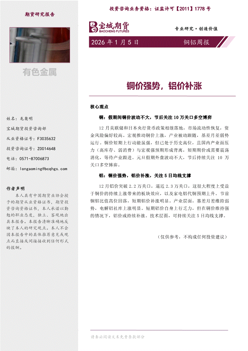 宝城期货-铜铝周报:铜价强势,铝价补涨-260105
