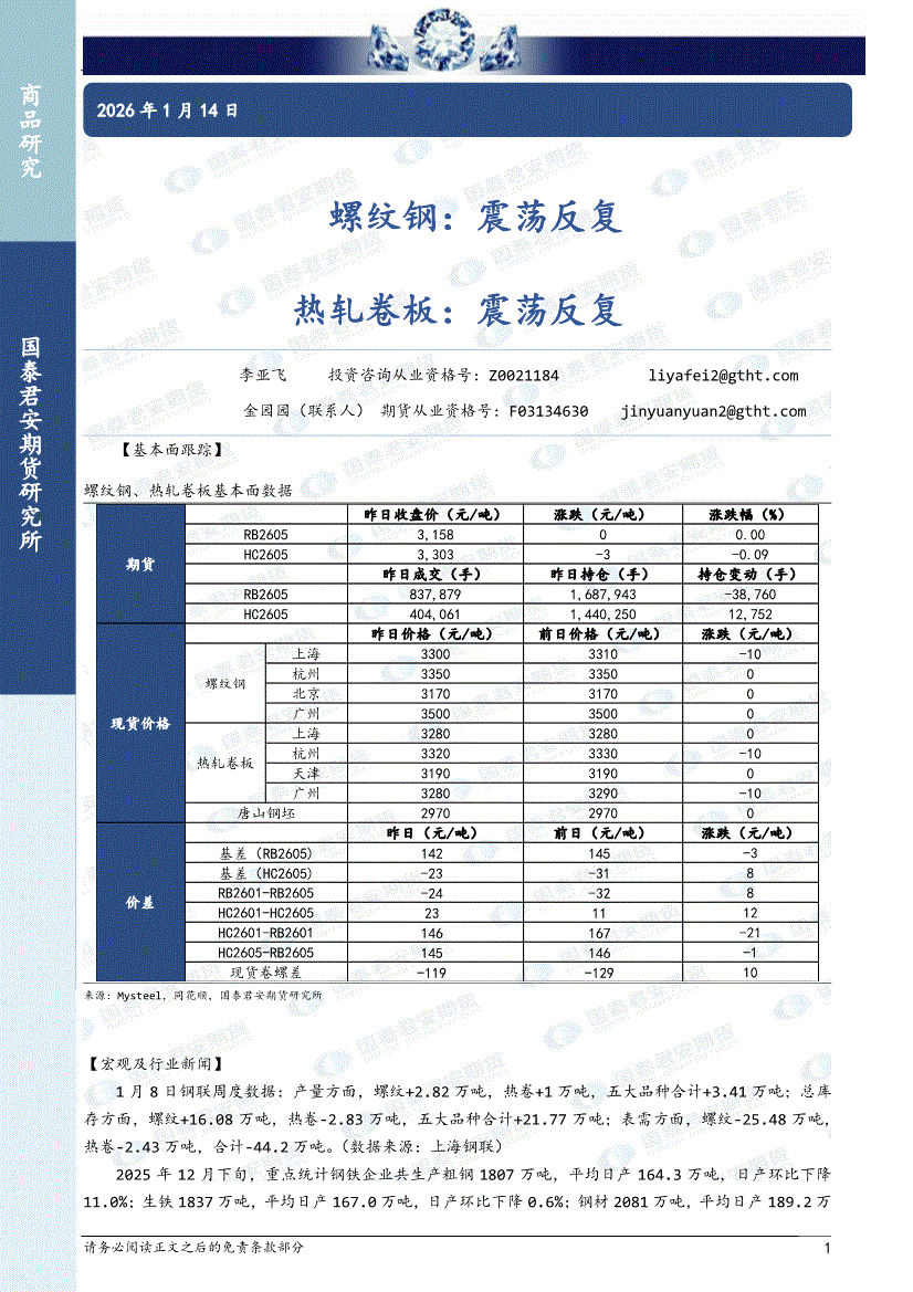 国泰君安期货-螺纹钢:市场情绪扰动,盘面宽幅震荡,热轧卷板,市场情绪扰动,盘面宽幅震荡-260109