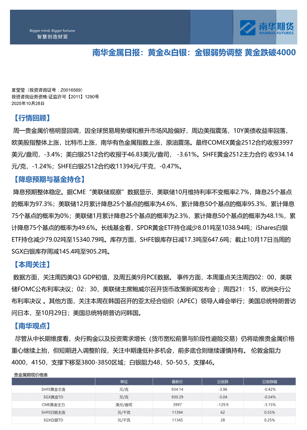 南华期货-金属日报:黄金、白银,金银弱势调整,黄金跌破4000-251028
