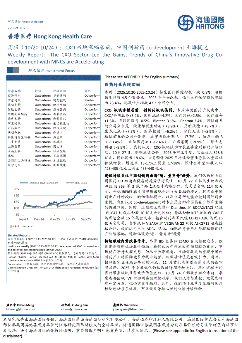 医疗行业:海通国际-香港医疗行业周报(10/20~10/24):CXO板块涨幅居前,中国创新药co~development出海提速-251027