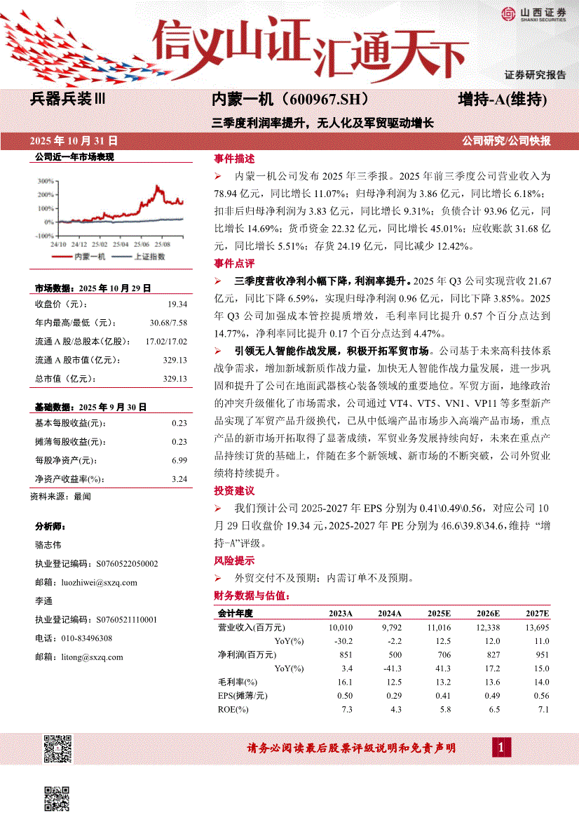 内蒙一机:山西证券-内蒙一机-600967-三季度利润率提升,无人化及军贸驱动增长-251031