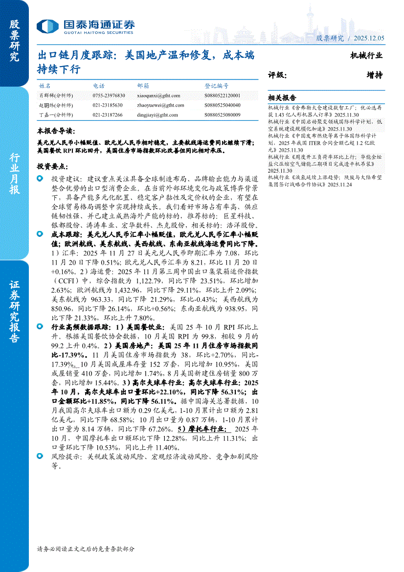 机械行业:国泰海通证券-机械行业出口链月度跟踪:美国地产温和修复,成本端持续下行-251205