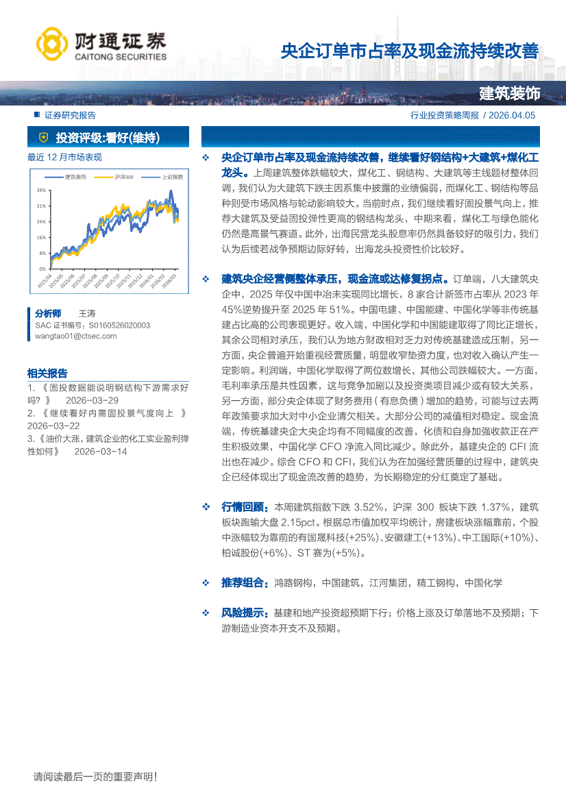 建筑装饰行业:财通证券-建筑装饰行业投资策略周报:央企订单市占率及现金流持续改善-260405