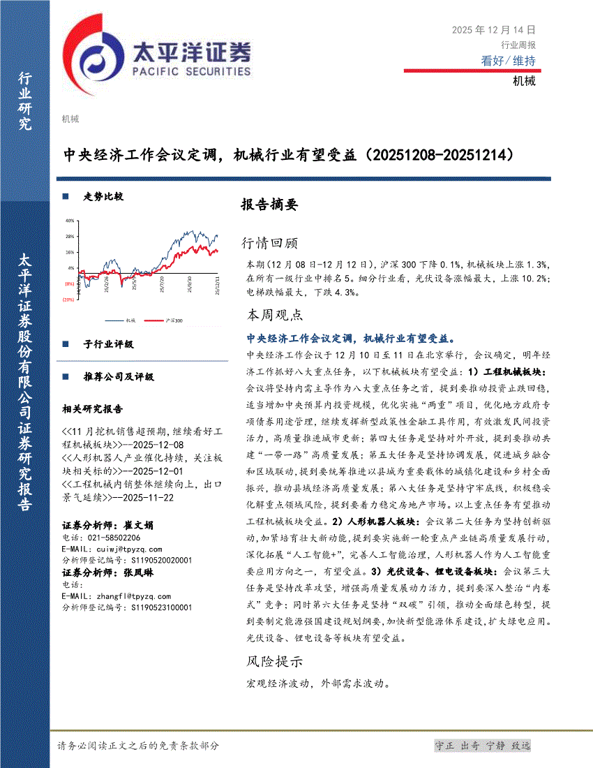 机械行业:太平洋证券-机械行业周报:中央经济工作会议定调,机械行业有望受益-251214