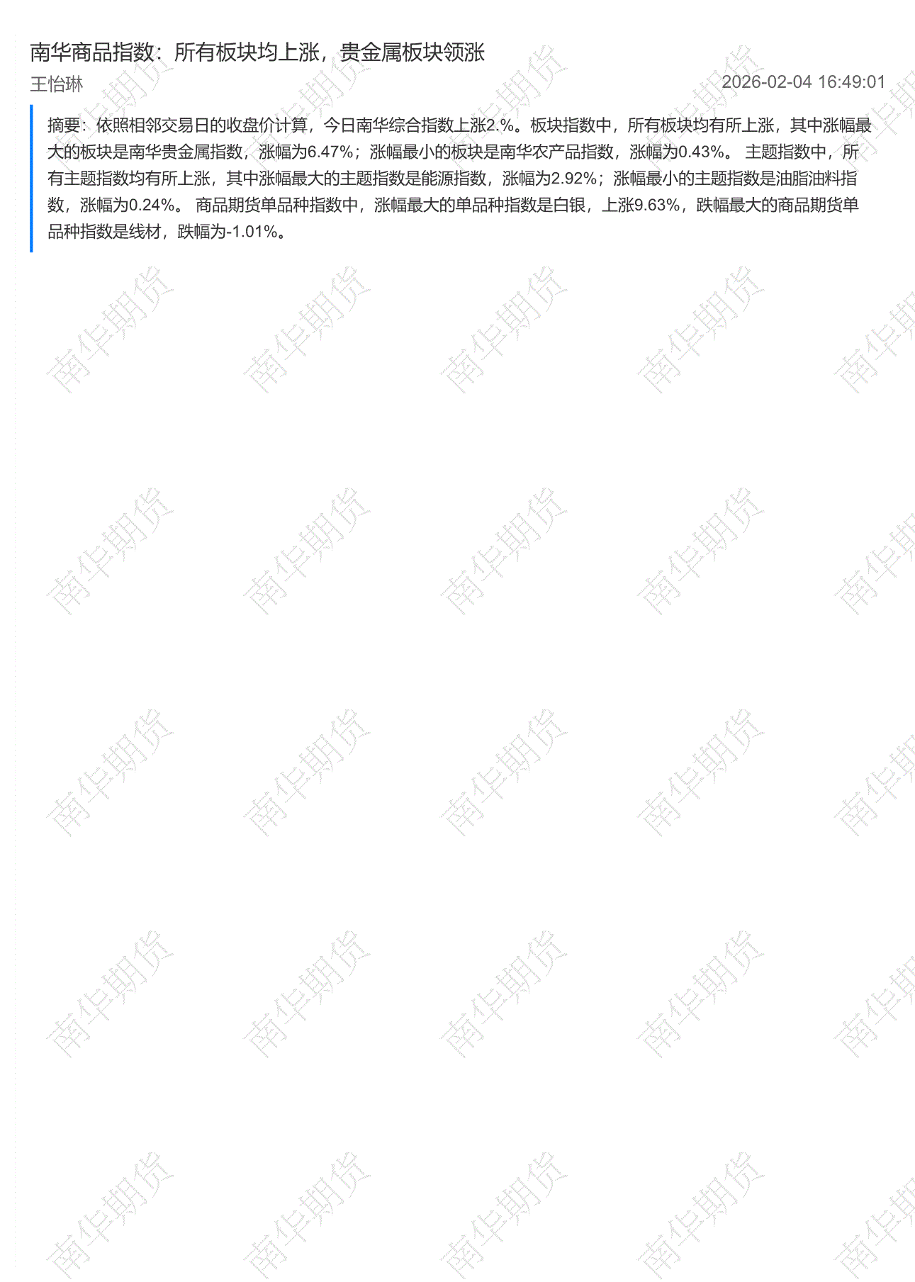 南华期货-商品指数:所有板块均上涨,贵金属板块领涨-260204
