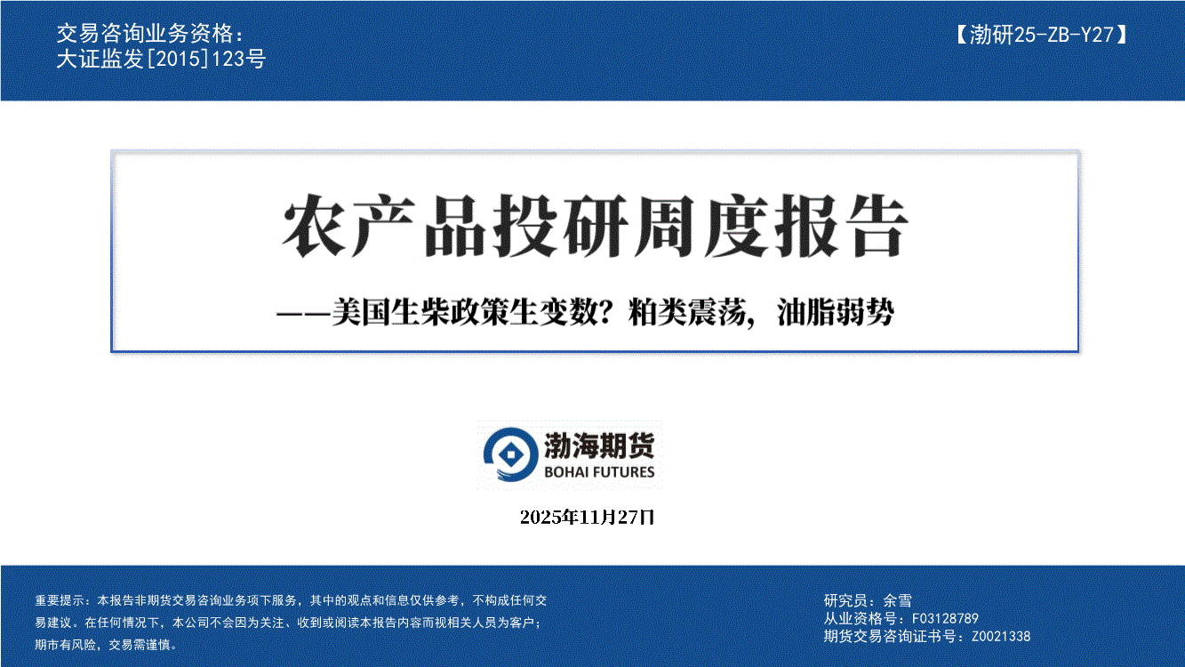渤海期货-农产品投研周度报告:美国生柴政策生变数?粕类震荡,油脂弱势-251127