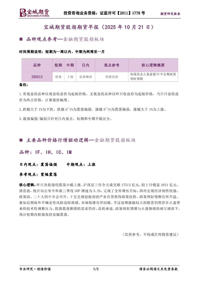 宝城期货-股指衍生品周报:短期内股指宽幅震荡为主-251020