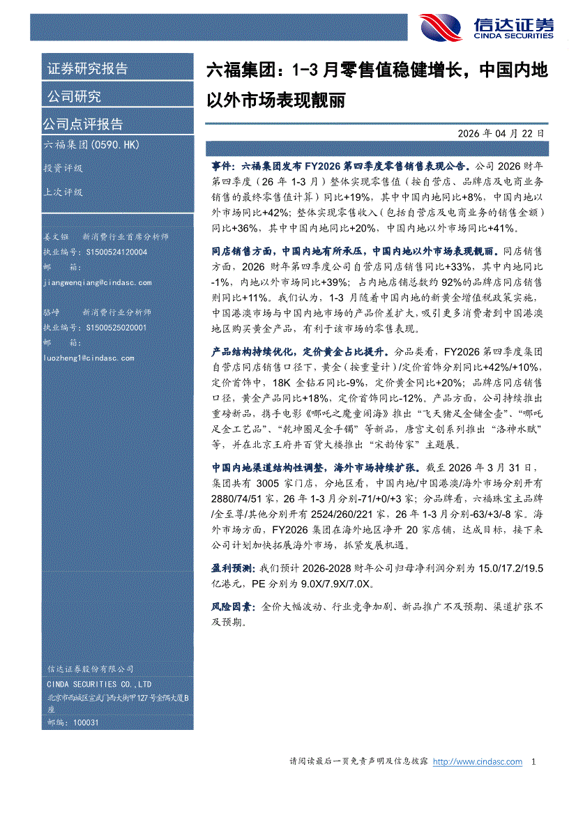 六福集团:信达证券-六福集团-0590.HK-1~3月零售值稳健增长,中国内地以外市场表现靓丽-260422
